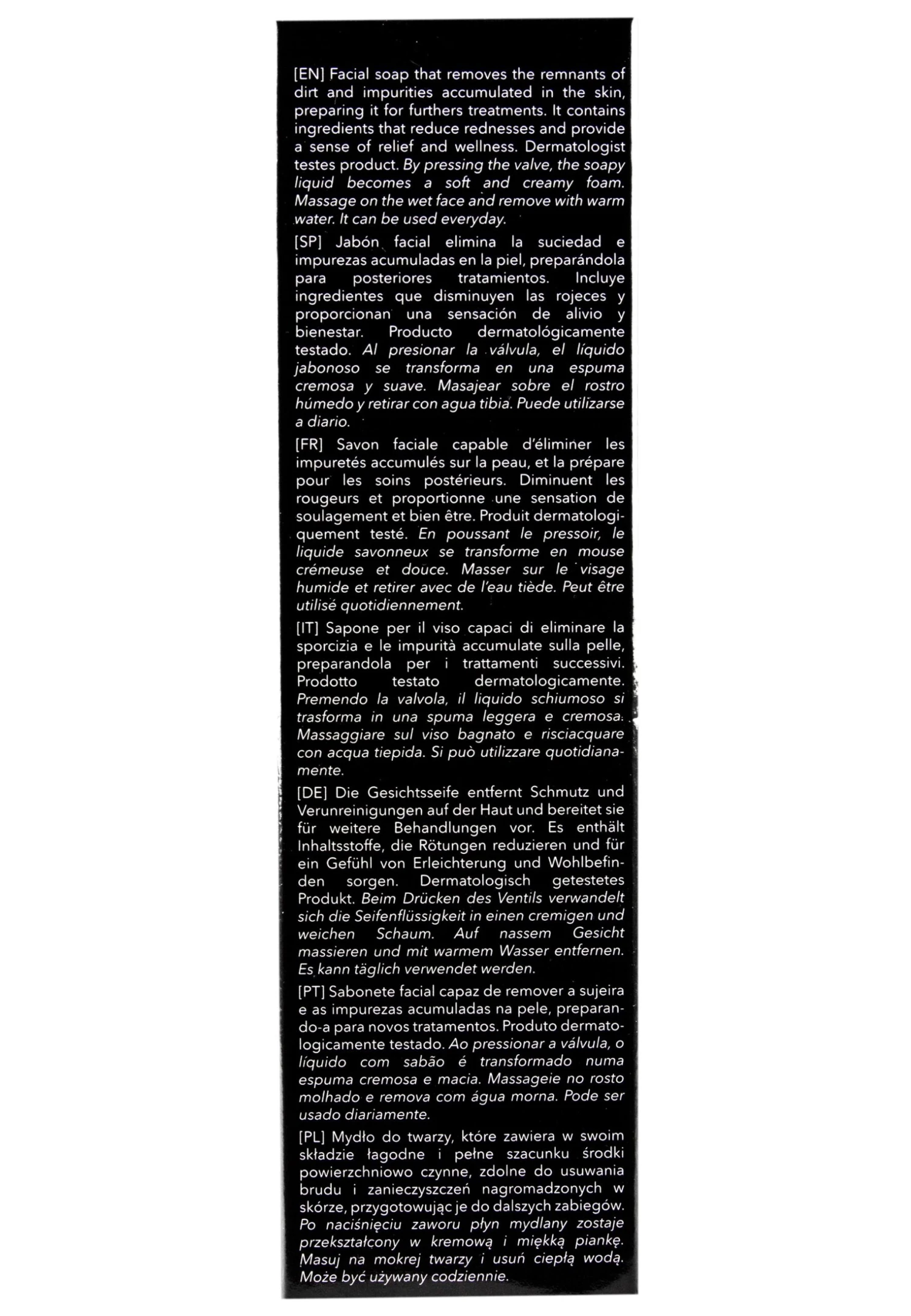 | Componenti | AQUA (WATER), SODIUM LAURETH SULFATE, CAPRYLOYL/CAPROYL METHYL GLUCAMIDE, PROPANEDIOL, POLYGLYCERYL-4 LAURATE/SEBACATE, POLYGLYCERYL-6 CAPRYLATE/CAPRATE, PEG-7 GLYCERYL COCOATE, BIOSACCHARIDE GUM-2, CITRIC ACID, DEHYDROACETIC ACID, BENZYL ALCOHOL, BENZOIC ACID, PHENOXYETHANOL, PARFUM (FRAGRANCE). |