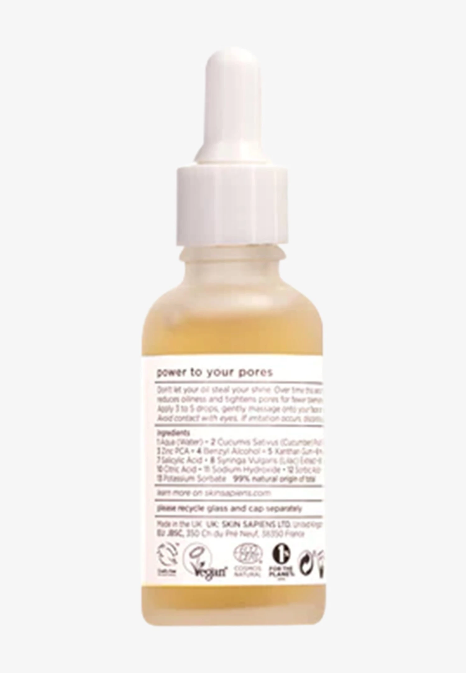 | Componenti | 1. Acqua (Wasser)\n2. Cucumis Sativus Fruchtextrakt/ aus Gurke\n3. Zink PCA/ im Labor hergestellt*\n4. Benzylalkohol/ im Labor hergestellt* \n5. Xantham Gum/ biologisch gewonnenes Gummi\n6. Maltodextrin/ aus Mais, Reis, Kartoffelstärke und Weizen\n7. Salicylsäure/ im Labor hergestellt*.\n8. Syringa Vulgaris Extrakt/ aus Fliederblüten\n9. Glycerin/ aus Palm-** und Kokosnussöl\n10. Zitronensäure/ im Labor hergestellt*.\n11. Natriumhydroxid/ im Labor hergestellt*.\n12. Sorbinsäure/ im Labor hergestellt*\n13. Kaliumsorbat/ im Labor hergestellt*\n\n * von ECOCERT genehmigt\n** aus zertifizierten nachhaltigen Quellen |